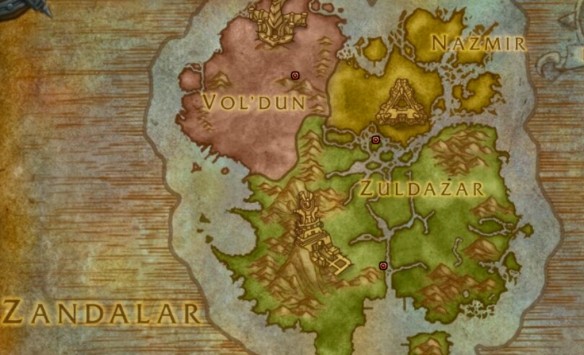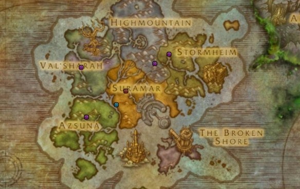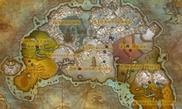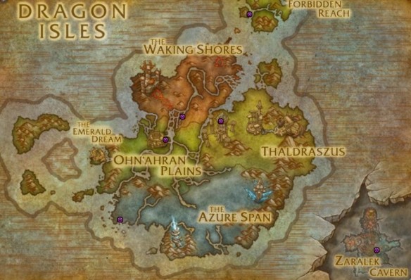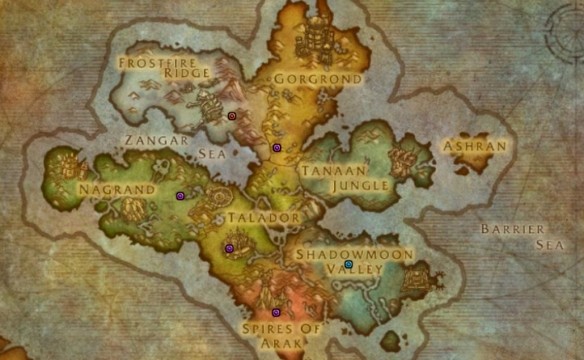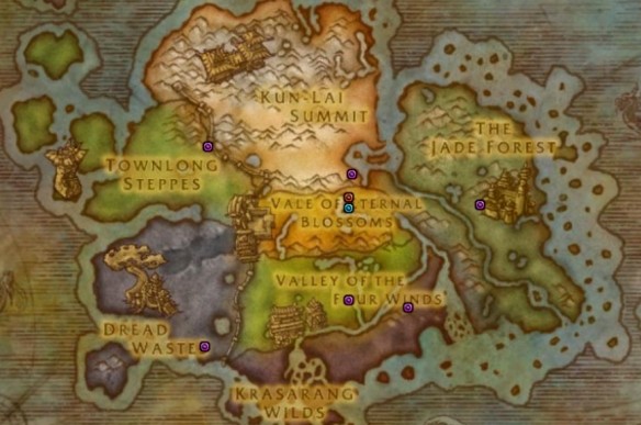 3、下圖中藍點為聯盟陣營、紅點為部落陣營、紫點為雙陣營、黃點為陣營主城的篝火。